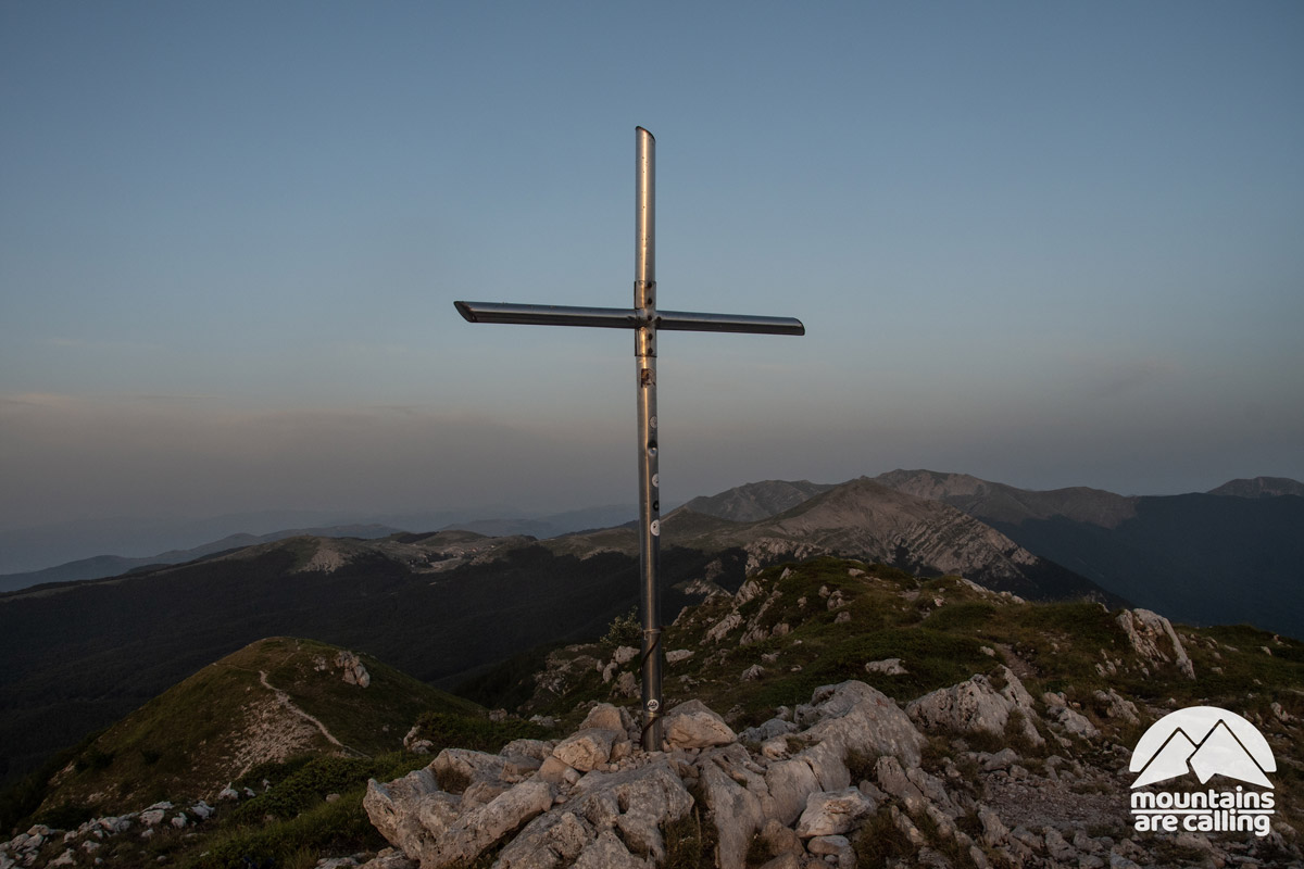 Arriviamo a Campo Staffi che il sole già ha abbandonato il punto più alto della sua traiettoria giornaliera e la calda luce radente abbraccia gli altopiani e le vette. Ci inoltriamo di buon passo nella faggeta, su un sentiero ben battuto e in leggera discesa, fino a raggiungere il grande spiazzo erboso di Passo Monna Forcina. Da qui ci inerpichiamo ripidamente sul fianco del Monte Tarino, ora dentro ora fuori dagli alberi. Il respiro si affatica mentre ci lanciamo in un inseguimento impari del sole, che scende inesorabilmente. Spuntiamo infine sulla cresta affilata che separa il Vallone Roglioso da Campo Ceraso e voliamo sul sentiero stretto e roccioso, fino a raggiungere la croce di vetta del Monte Tarino. Davanti a noi ci aspetta infuocato il sole prossimo al tramonto, mentre sul Monte Cotento e il lontano Velino già avanzano i colori del crepuscolo.